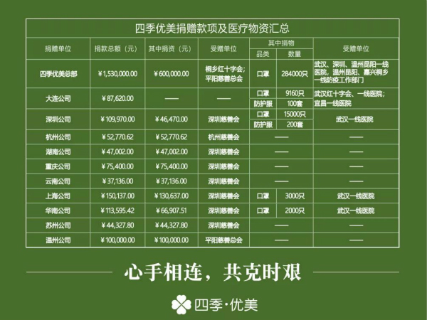 截至2月5日,四季優(yōu)美(含公司捐贈(zèng)、創(chuàng)始人個(gè)人捐贈(zèng)及全國(guó)各分公司捐贈(zèng))累計(jì)為抗疫定向捐贈(zèng)物資口罩313,160只、防護(hù)服300套,資金捐贈(zèng)1,200,650.93元,合計(jì)金額2,347,958.84元。