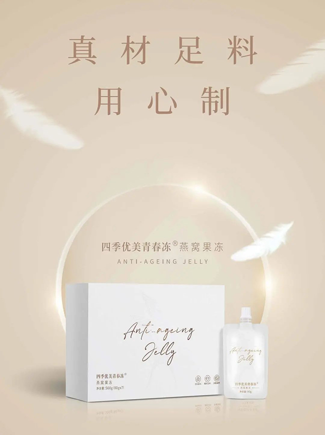 每一袋四季優美青春凍燕窩果凍所含干燕窩更是多達1.2g,同時,魚膠原蛋白肽、葛根粉、奇亞籽、水蘇糖、低聚木糖、低聚果糖等多種珍貴原料的加入,使四季優美青春凍在營養價值、飽腹感及產品綜合體驗方面,都實現了顯著的提升,每天一袋,即可滿足日常滋補所需,滿滿的真材實料,口感更好吃,內涵更健康。